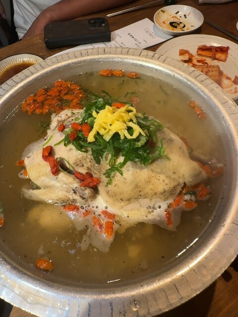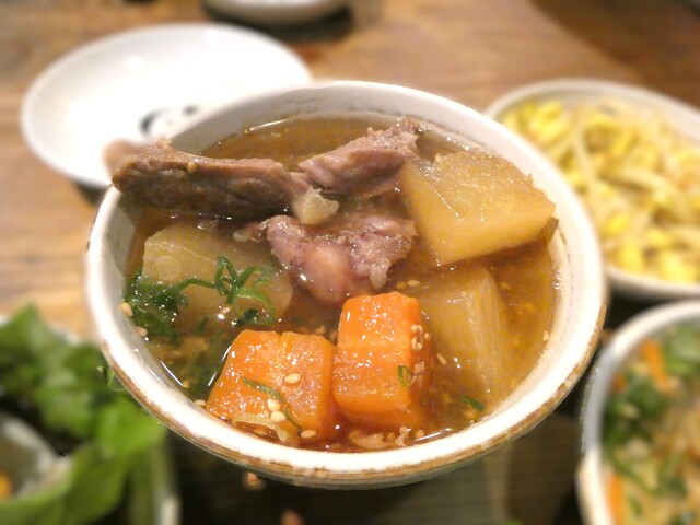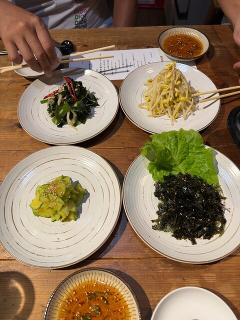 料理は、ナムル、チヂミ、ケジャン、デジカルビ、鮑粥、参鶏湯など、かなり欲張...