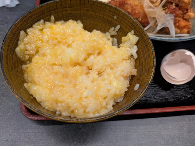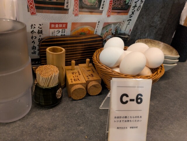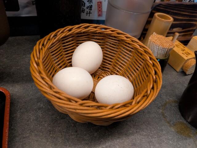 席の前には生卵が入ったカゴが置かれています。なんでも、生卵食べ放題だそうです。