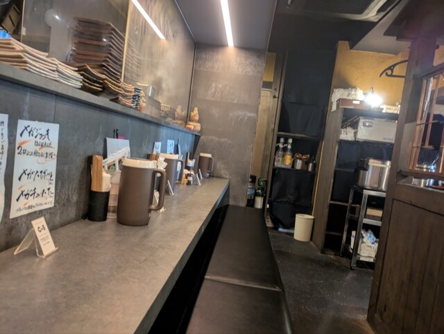 店内は典型的な居酒屋さんといった雰囲気で、昼間でも結構暗いです。テーブル席とカウンター席があります。今回はカウンター席に座りました。