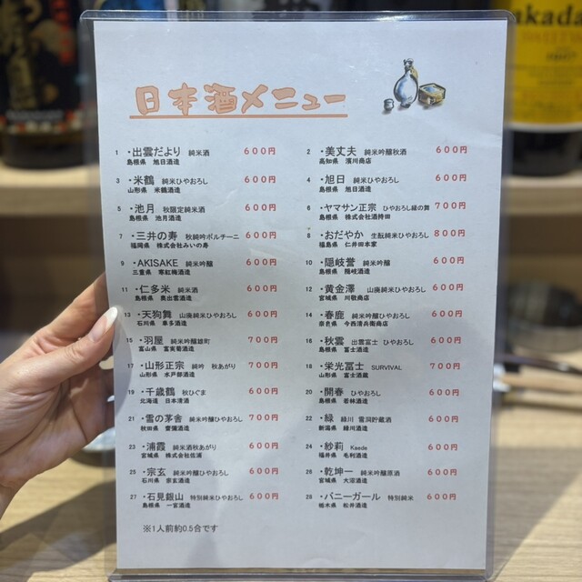 | ドリンク | 日本酒あり、焼酎あり、ワインあり、カクテルあり、日本酒にこだわる |