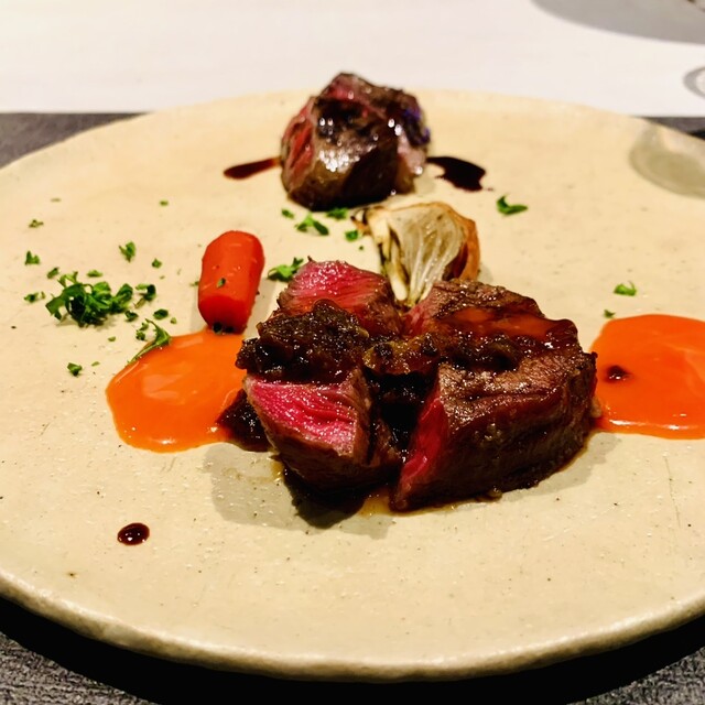 和牛を主役に、炭火の火入れとソースの構成で一皿を仕立てる肉料理のレストラン。但馬牛を中心とした和牛を使用し、部位ごとの個性を生かした料理を提供しています。イタリア料理をベースにしながらも、ジャンルにとらわれないコース構成で、前菜から肉料理、締めまで一貫した流れを大切にしています。料理に寄り添うワインとともに、落ち着いた空間で和牛の魅力をご堪能ください。