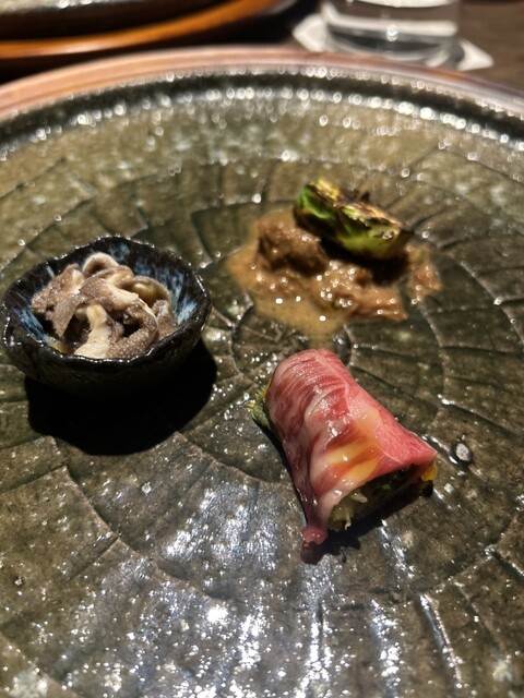 但馬牛 三種食べ比べ 炭火焼きおまかせコース 但馬牛の異なる部位を三種ご用意し、それぞれの個性を活かした食べ比べをお楽しみいただくおまかせコースです。 メインには、炭火で香ばしく焼き上げた和牛ステーキをご提供。 前菜からメインにかけて、和牛と季節の野菜、旬の食材を組み合わせたお料理を構成し、素材の魅力を引き出した一皿一皿をお楽しみいただきます。 その時季ならではの食材と和牛の表情を大切にした、当店ならではのおまかせコースです。