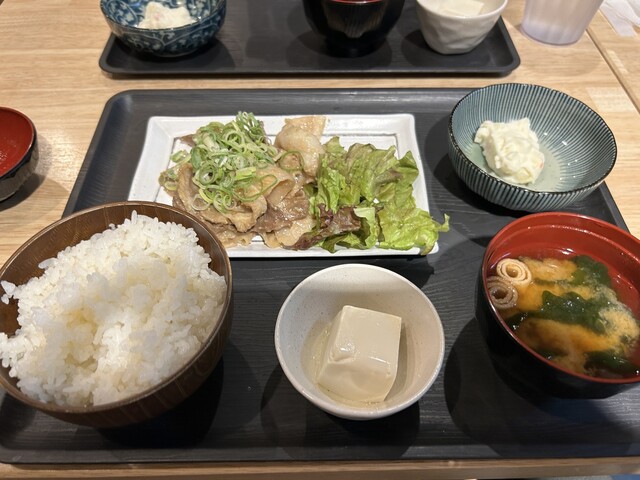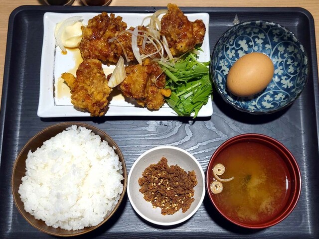先にお盆と小鉢が到着。ご飯、味噌汁、生卵はセルフ。ご飯と味噌汁は厨房に向かって左手、生卵は右手と分かれているので注...