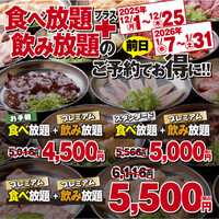 【新年会に!】 お手軽食べ放題+プレミアム飲み放題付 5,016円 ⇒4,500円(税込)!!