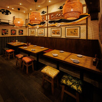 店内は昭和の情緒とアジアの熱気が融合したような、天井から吊るされた提灯と木のテーブルを温かみがある不思議な空間