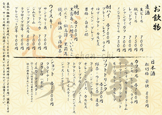 サービス料10%、チャージ料あり ~24:00 \600 24:00~ \1200 |
