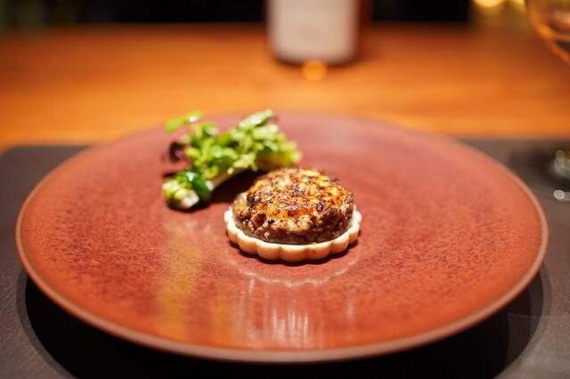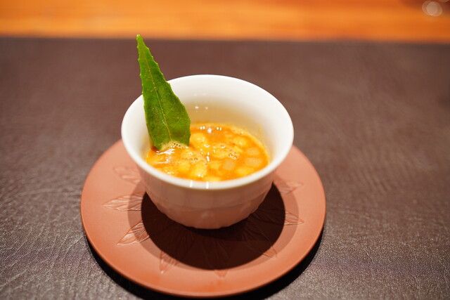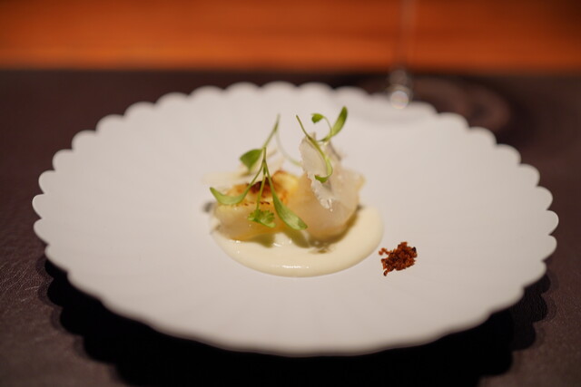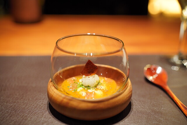 カモシヤ クスモト、その奇妙な店名は、 楠本則幸シェフの手に依る料理を「醸す酒(醸造酒)」と マリアージュさせると云うコンセプトに由来する。 その名前通り、お酒は全て醸造酒のラインナップ。 一方、料理は和食とフレンチをその骨格としながらも 独自のクリエーションを見せて、その完成度は白眉!