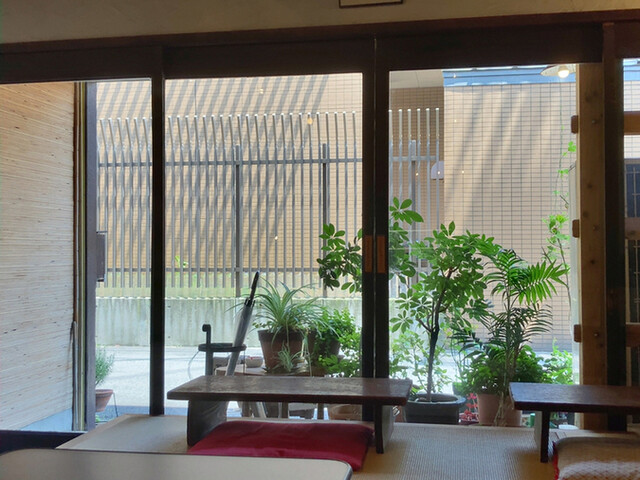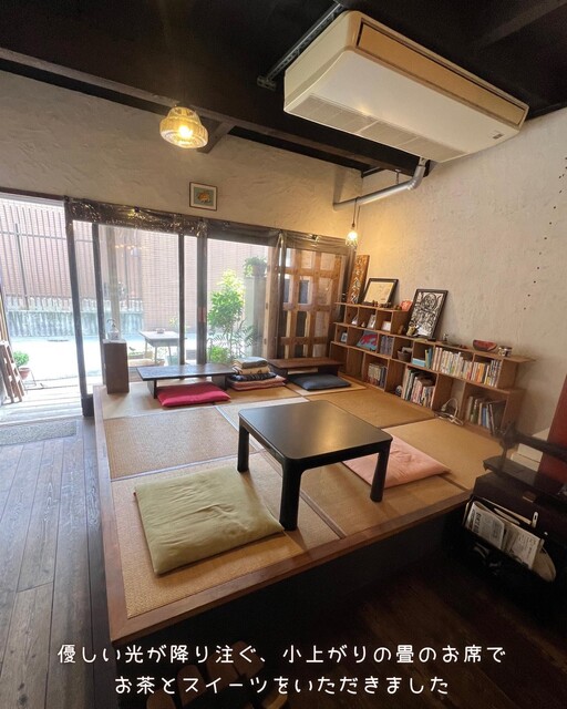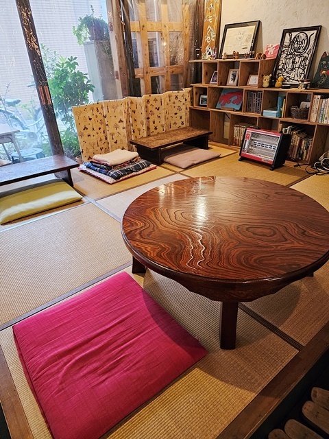 靴を脱いで寛ぐ畳スペースとテーブル3卓