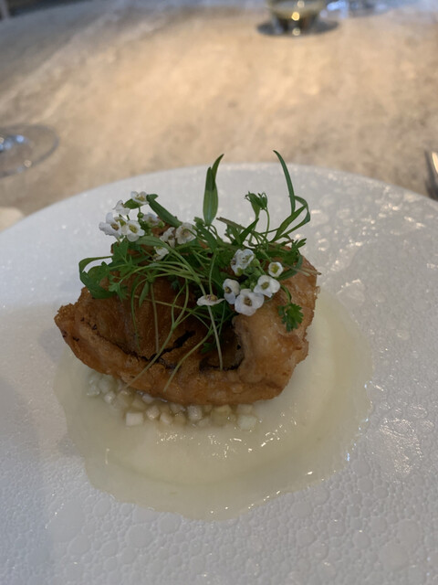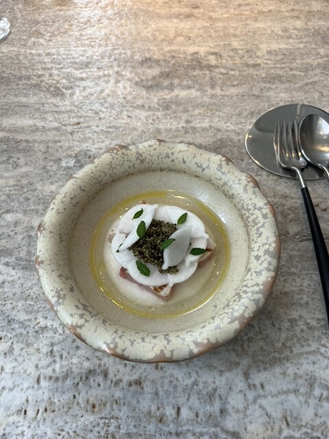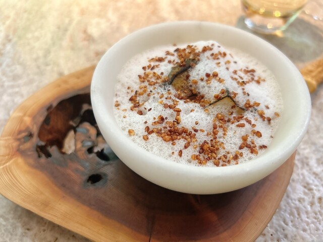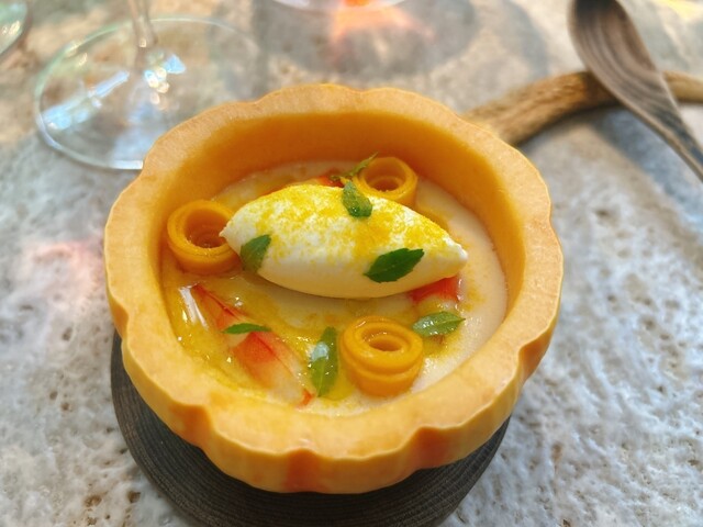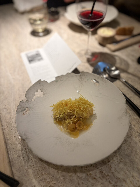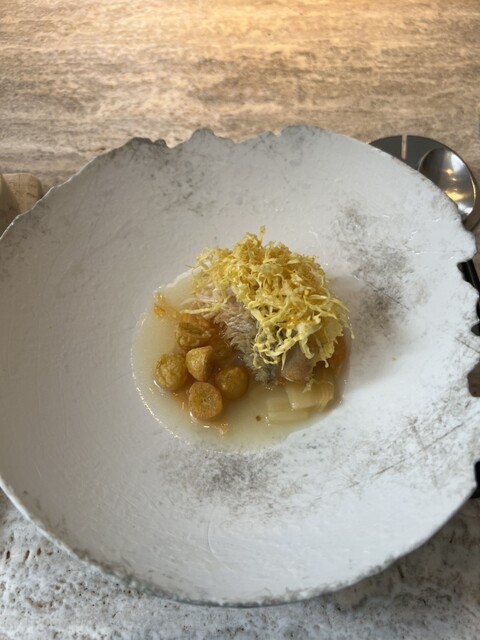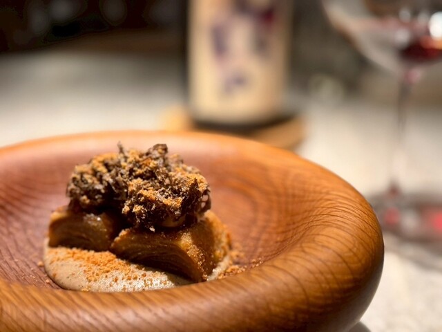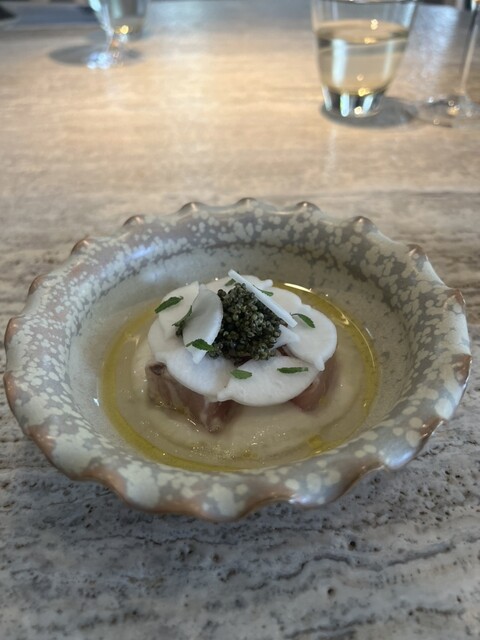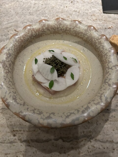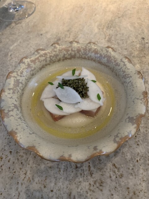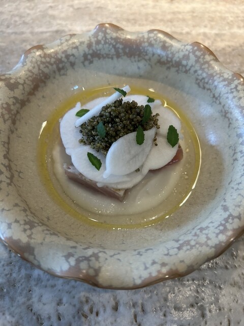 まずは徳島産の寒ブリ。聖護院かぶのピューレと甘さと、レホールの辛さのバランスが美味しいです。ブリはスモークされていて香ばしい。木の芽も利いています。