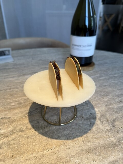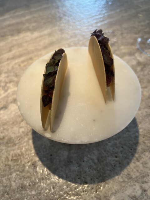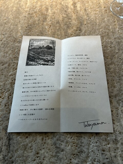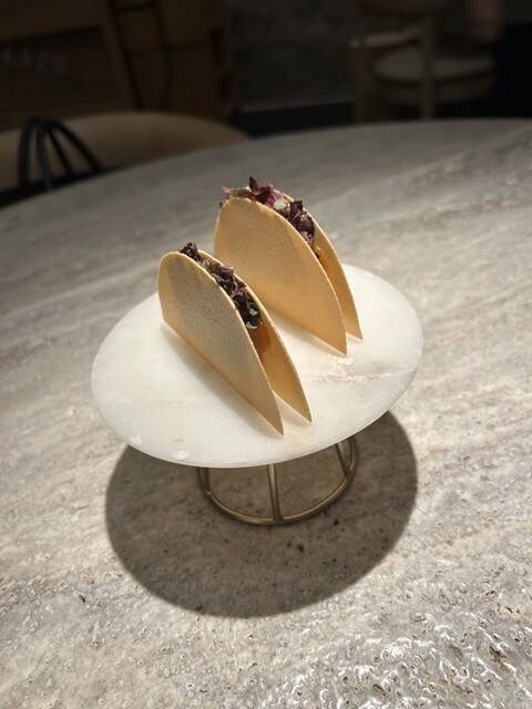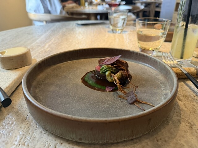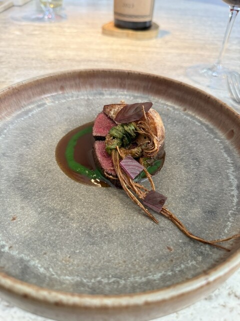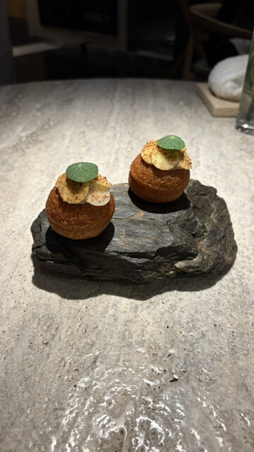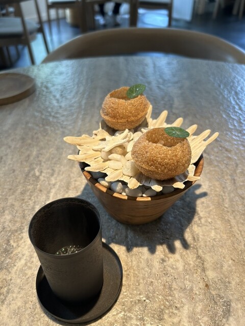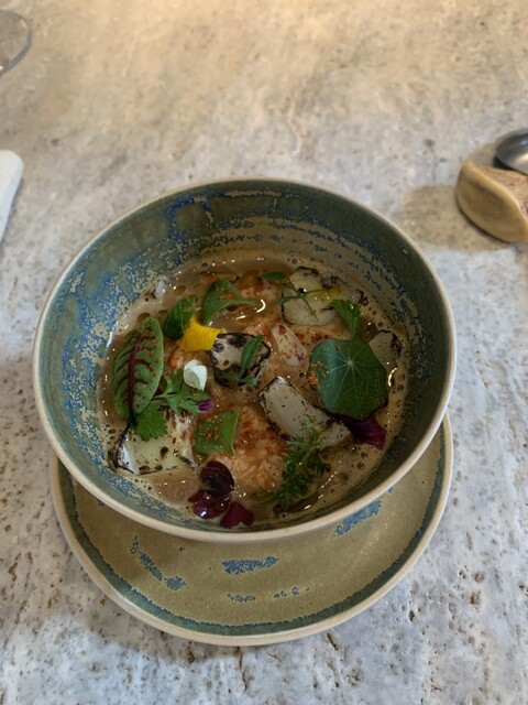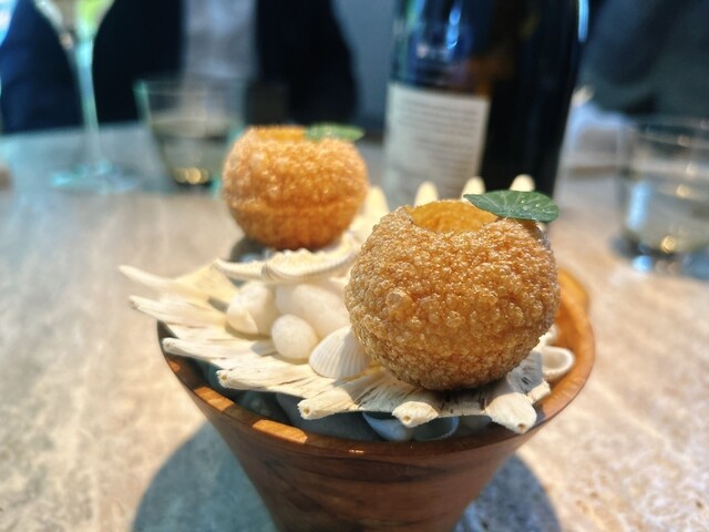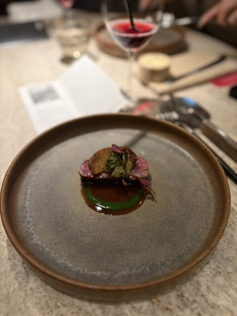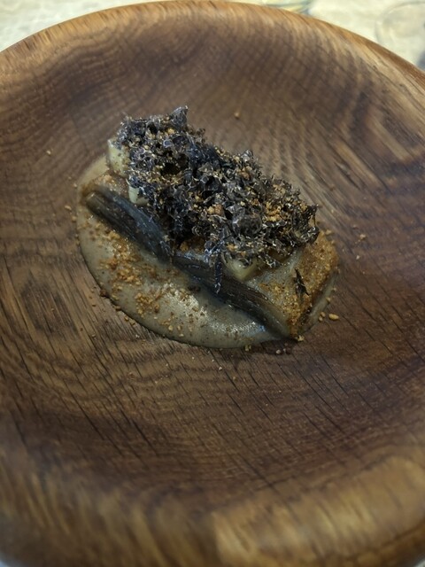 まずは徳島産の寒ブリ。聖護院かぶのピューレと甘さと、レホールの辛さのバランスが美味しいです。ブリはスモークされていて香ばしい。木の芽も利いています。