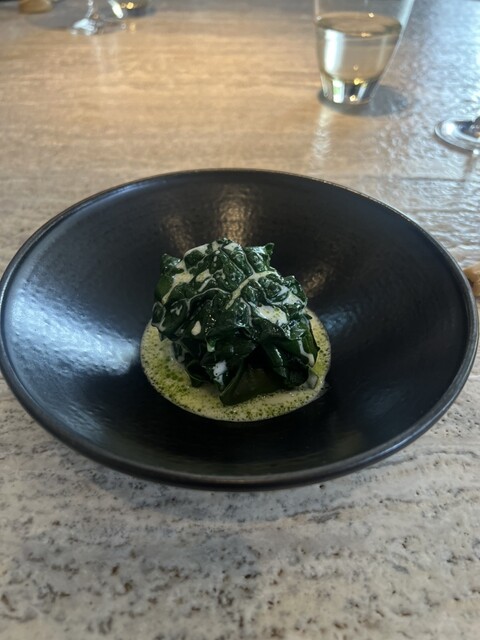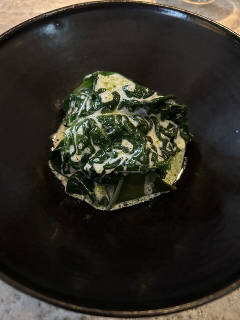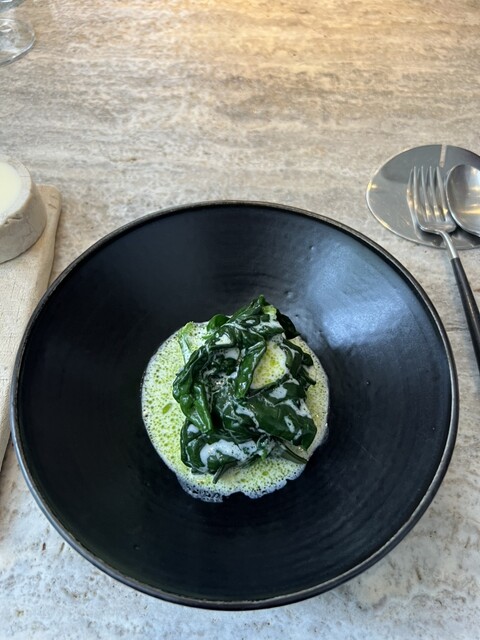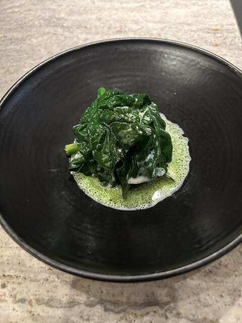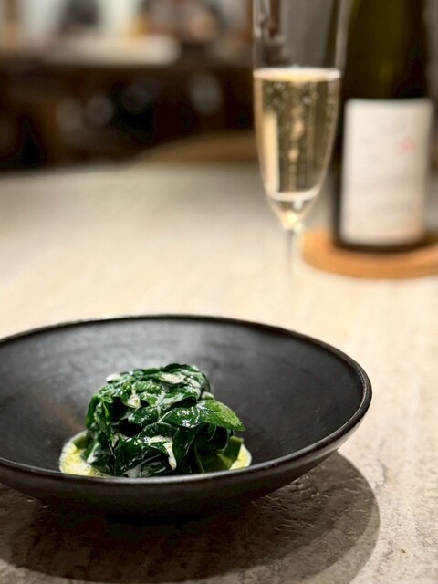 牡蠣とちぢみほうれん草にフロマージュブランのソース。旬を感じるひと皿、濃厚な...