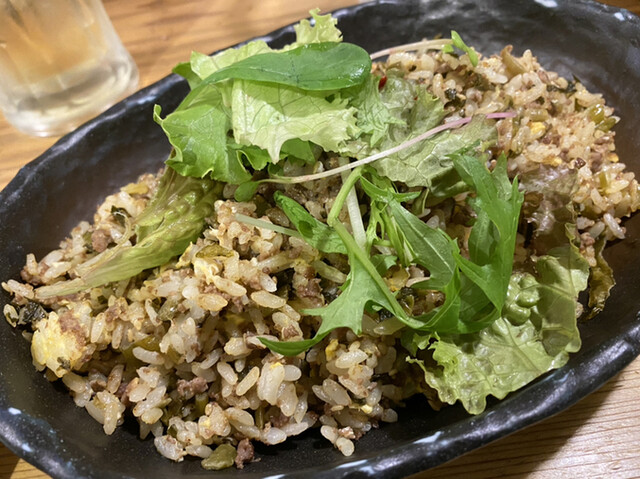 高菜と牛挽肉の炒飯 他は ・鉄人玉子の明石焼風出汁巻き ・茶蕎麦サラダ ・フライドポテト