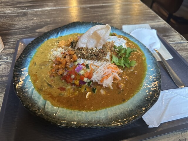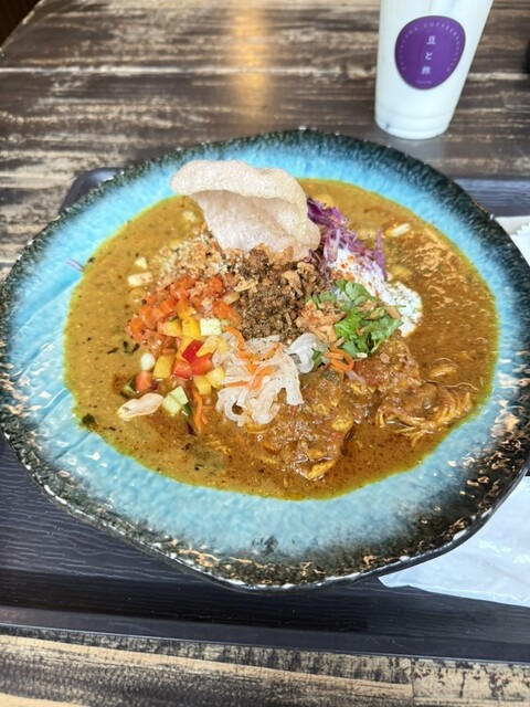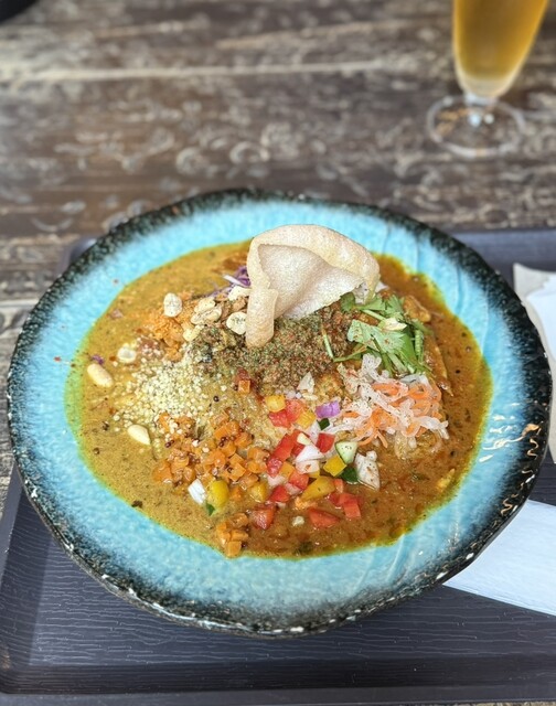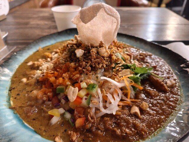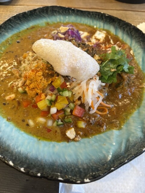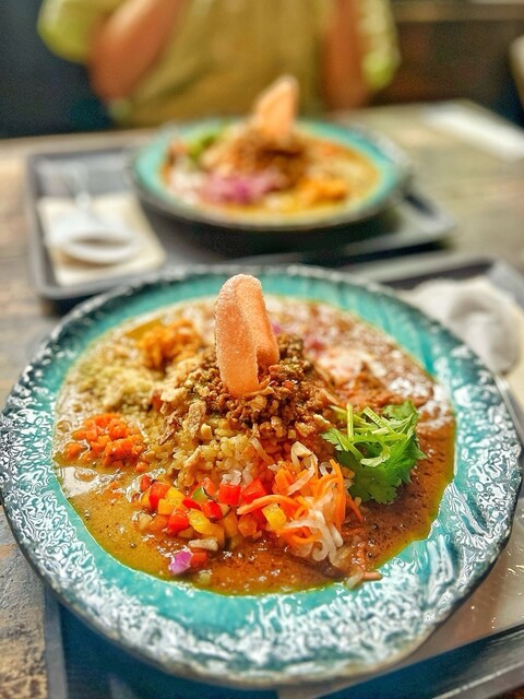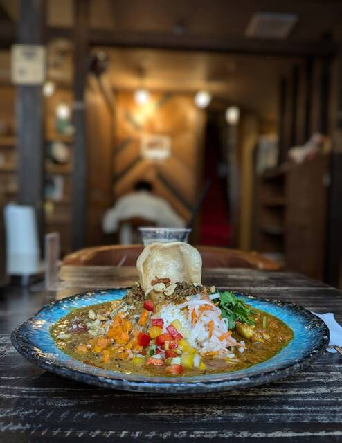新福島の路地にひっそりと佇むスパイスカレー店。古民家を改装した店内は、木の質感と陰影が柔らかく交わる空気を纏い、旅人の休息所のような静けさがある。