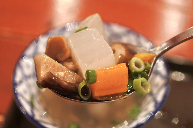 スープは鳥ガラの優しい味わいで角切り野菜やキノコがゴロゴロで美味い^^