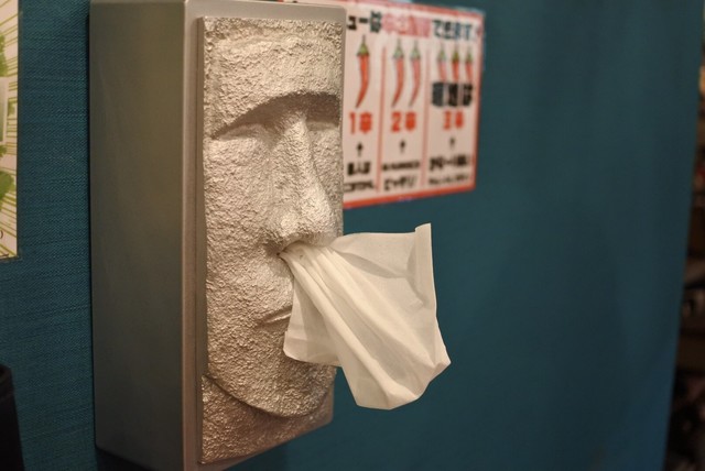 店の前には光り輝くネオンが仕込まれたモアイ像みたいな像が