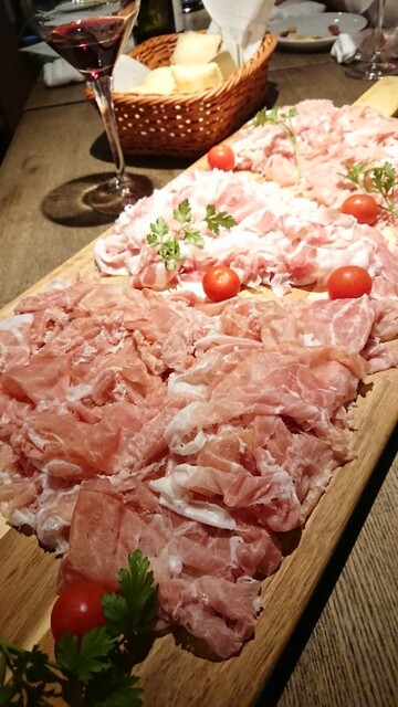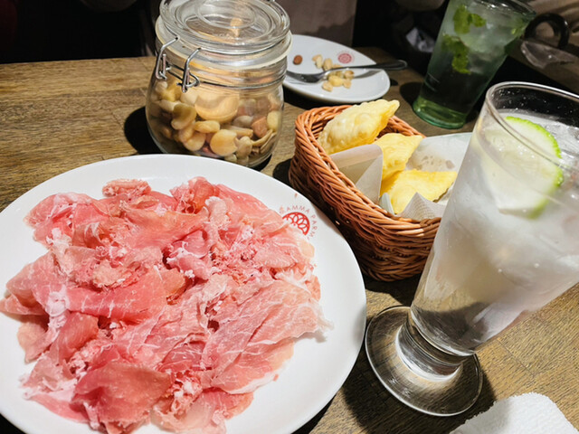 生ハム盛り合わせとオイルサーディンのマヨネーズ焼き、あとはパスタを1つ、デザート2皿頼んでしこたま飲みました!