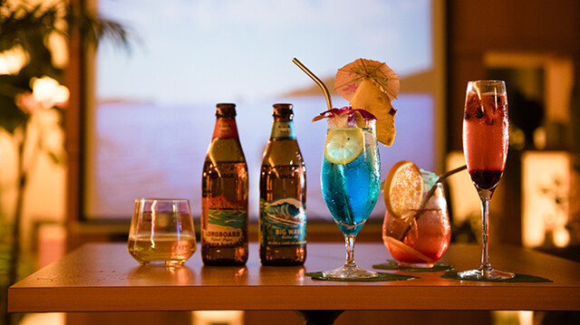 リキュールが並ぶ涼やかなカウンターとグリーンに囲まれたソファ、心地よいウクレレの音色が開放...