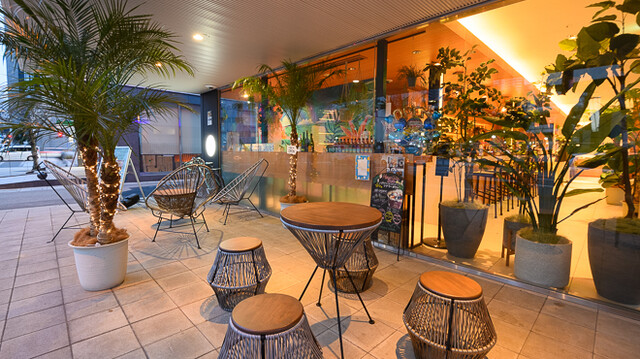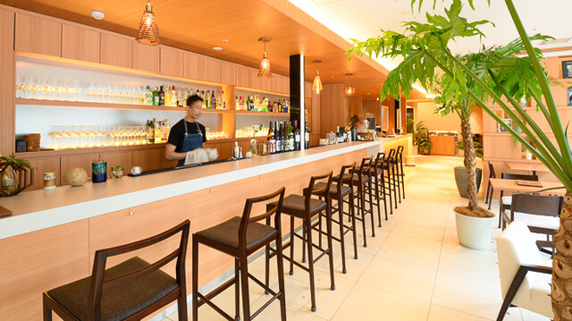 リキュールが並ぶ涼やかなカウンターとグリーンに囲まれたソファ、心地よいウクレレの音色が開放...