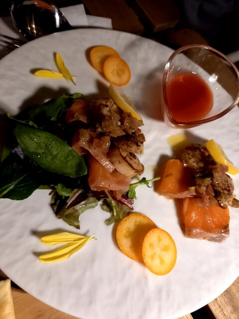 しめ鯖炙り燻製、彩野菜のピクルス、