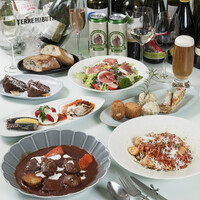 赤ワインをたっぷりつかったビーフシチューのファンはとても多く歴史あるお料理、このビーフシチューがメインになる当コースは、お店でスライスしている新鮮な生ハムが乗ったサラダ、ワインが飲みたくなる冷・温菜が3品ずつ、これまた人気定番のパスタ、デザートまでついた大満足コースです。 もちろんワイン飲み放題付き、ソフトドリンクやノンアルコールワインまで対象です。