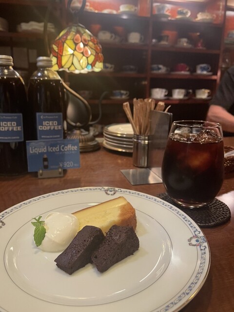 この日は「マイルドなアイスコーヒー」と、ケーキセットで「プリンケーキ半分+チョコレートケーキ半分」を選択。