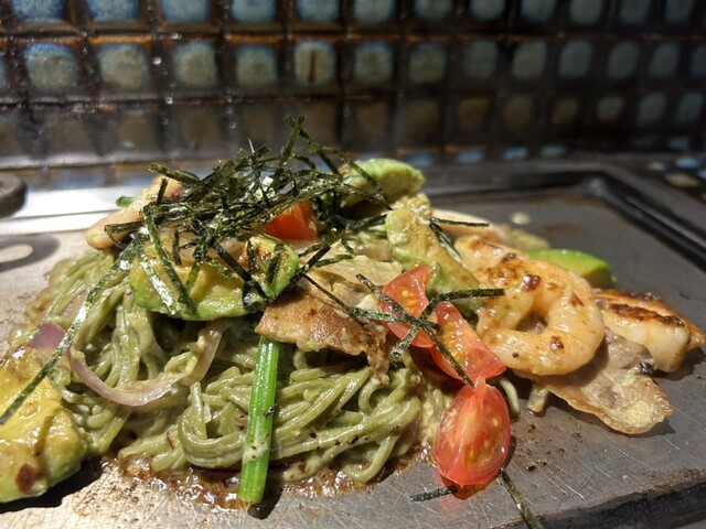 名物トマトお好み焼きやアボカド黒焼きそばなど野菜料理が豊富