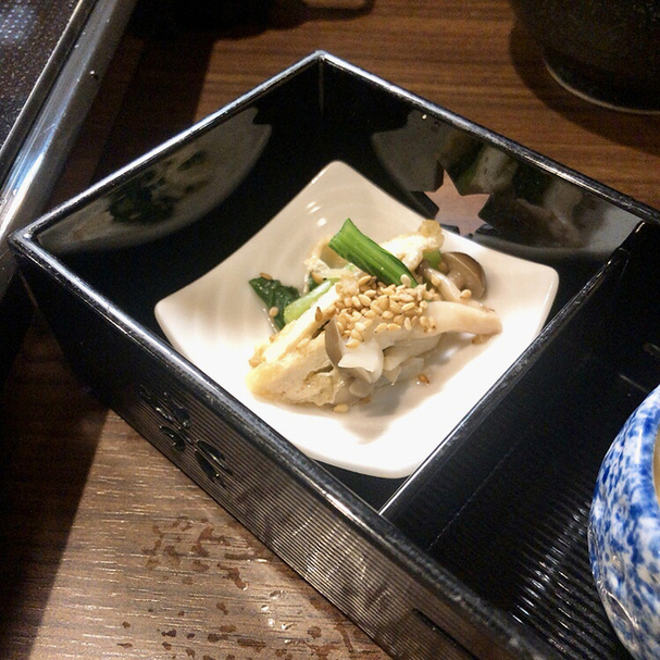 突き出しは3種類『鶏のカルパッチョ』『お豆腐』『きのこのマリネ』