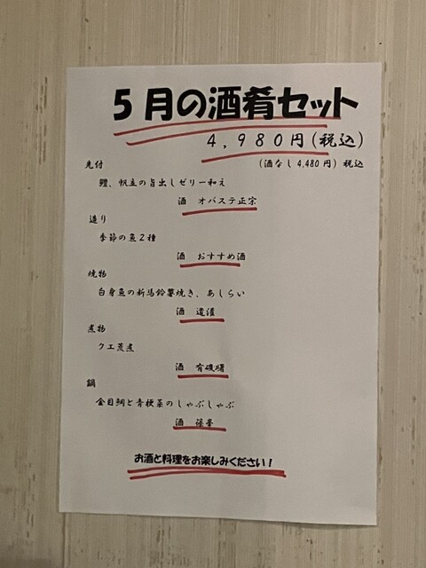 日本酒に合う居酒屋のコースは珍しく、4980円で5品と5種類の日本酒(冷酒と熱燗両方あり)がついて、本当に良心的な価格です。物価高の時代に、この価格を維持しているのは、店主の並々ならぬ...