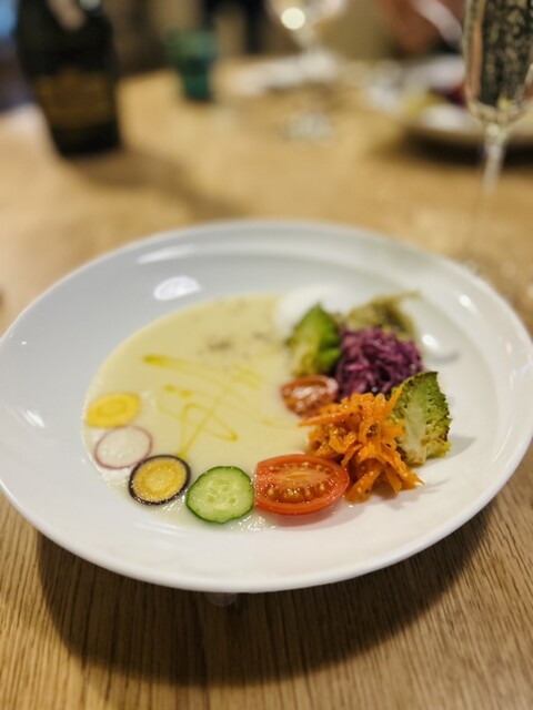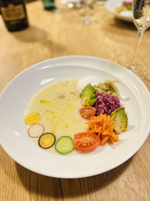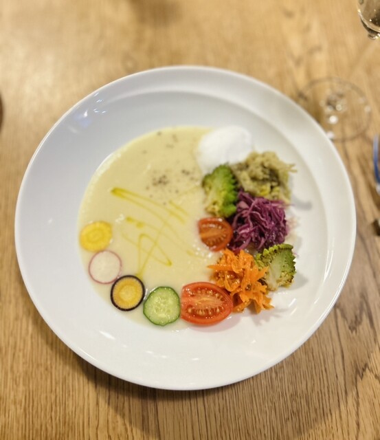 レビューで見ていた通りスープは芸術的で、今回はオレンジ白菜のスープ。しっかりとこして口どけめちゃくちゃなめらか。周りのカラフルな飾り野菜...