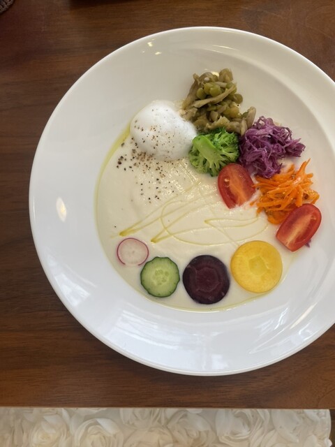 最初の紫芋のスープは、見た目が鮮やかで、味はとてもやさしい。クリームの重たさがなく、野菜の甘みがふんわ...