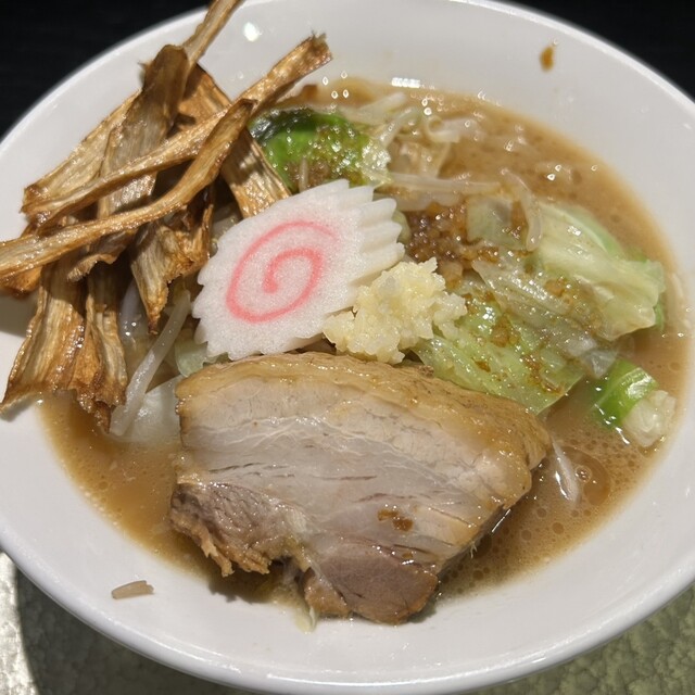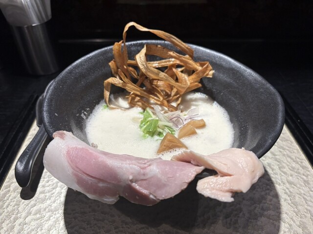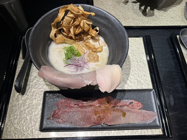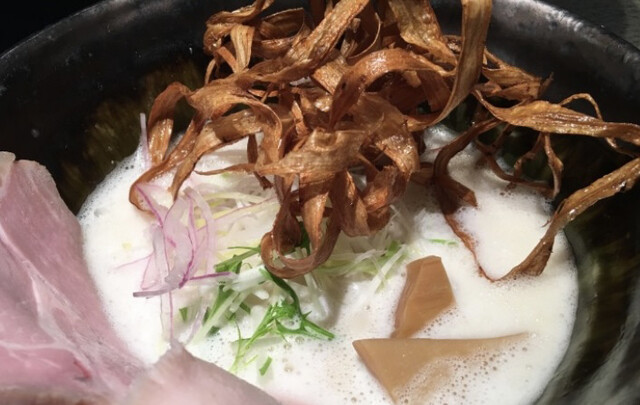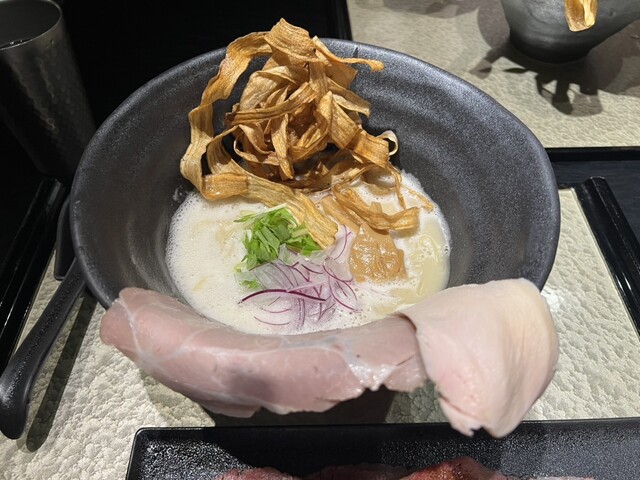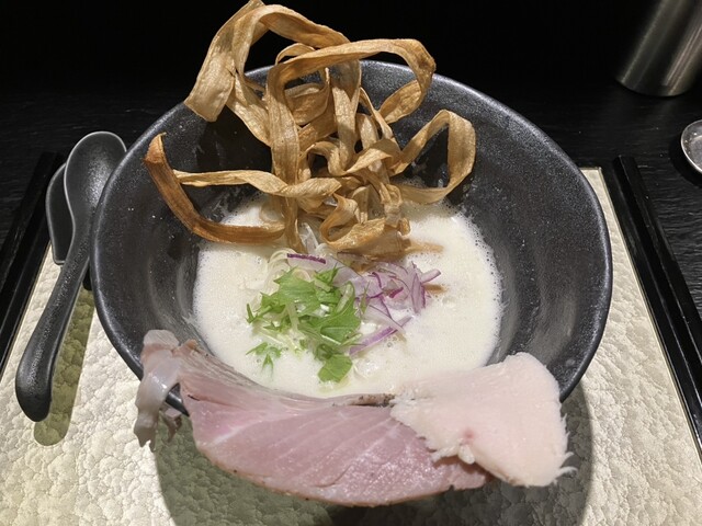 とても高級感のある濃厚でおいしいラーメンでした。ごぼうの揚げたものが技術的に盛り付けられており、とても高級感があるように2倍的にありました。