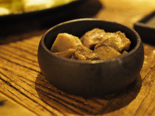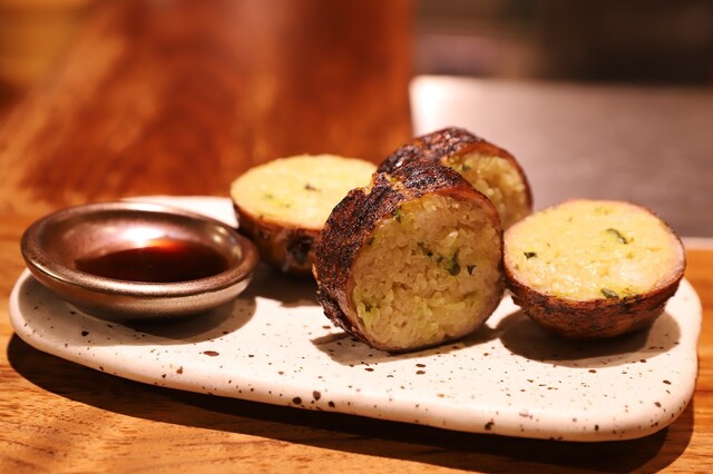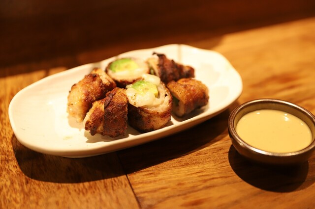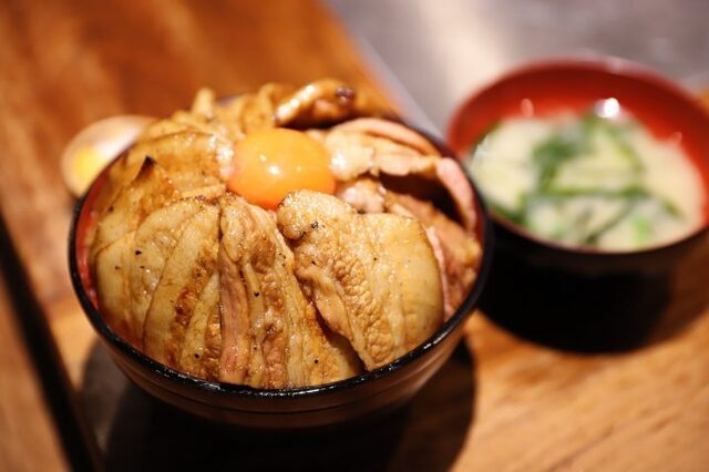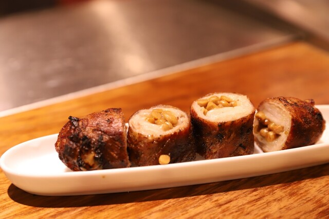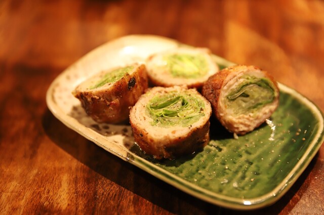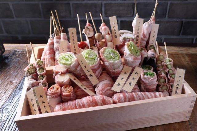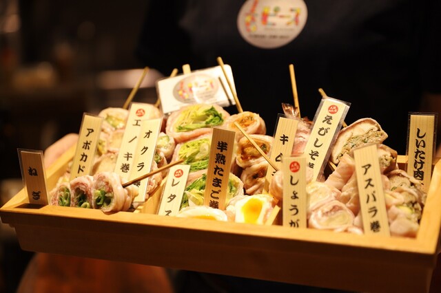 昭和初期に十勝帯広の発祥の豚丼。少し厚めにカットした豚肉を注ぎ足しを繰り返した秘伝のたれで焼き上げます。ご飯と豚肉と秘伝のたれが絶妙に絡み合い、箸が止まりません。豚肉は鹿児島黒豚茶美豚、お米は北海道ゆめぴりかを使用しています。 博多串焼きはキャベツの上に焼けた串焼を置いていくシステムで酢ダレで召し上がって頂きます。野菜巻串はレタス、マッシュルーム、ガリ、エノキなどを豚肉で巻いて焼き上げたものです。