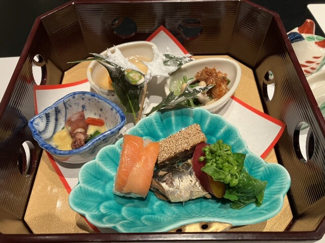 前菜4種・松茸土瓶蒸し・お造り(ブリとイカ)・焼魚(幽庵焼き)・お椀・鯛出汁茶漬け(...