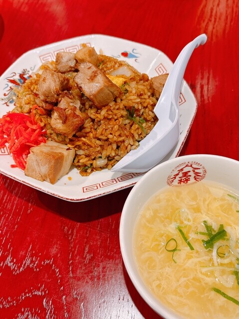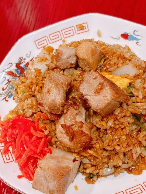 定番の焼豚炒飯はパラパラの炒飯にこれでもか!ってくらいに焼豚がはいっている。