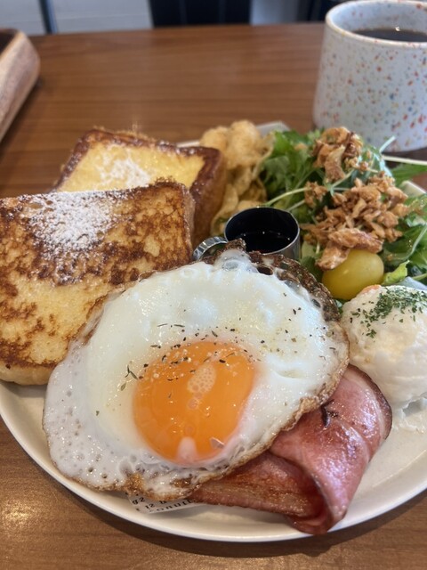 グリーンサラダ、ポテトサラダ、ベーコンエッグ