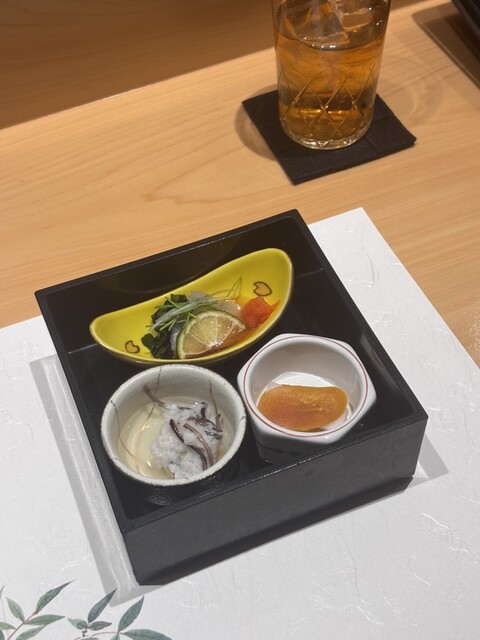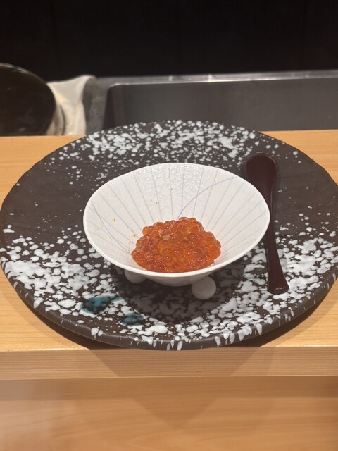 先付け、前菜3種、握り8種、ウニといくらの小丼、茶碗蒸し、玉子、香の物、お椀、甘味