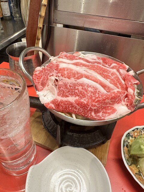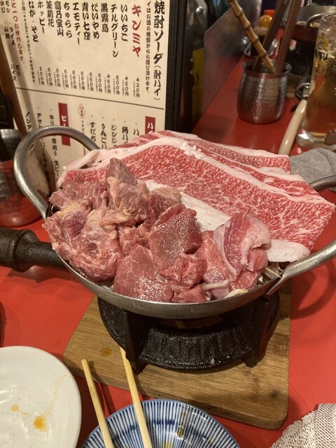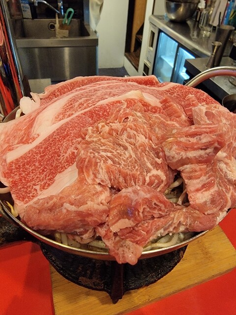 黒毛和牛の下に牛豚鶏の肉が敷きつめられた『肉を食べる為の鍋』