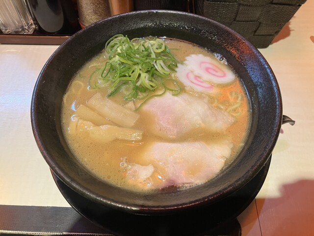 丼の縁をぐるりと囲む極薄スライスのチャーシュー。その中心には青ねぎ・メンマ・なると。スープは赤みを帯びたピリ辛トンコツで、レンゲを入れるたびに香りがふわ...
