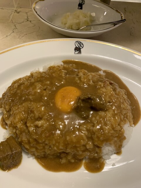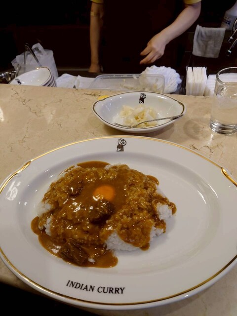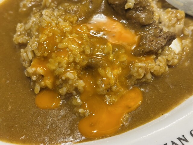 注文はいつも横がけ玉子。自分でカレーとご飯の比率をスプーンの上で配分して食べたいから…。