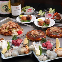 7種類の生地を独自にブレンドし、外はカリッ、中はトロッ。のたこ焼から、お好み焼・焼きそば。自身で焼いていただく海鮮とお肉、季節の野菜。満足間違いなしのコースです。もちろん飲み放題もついての価格です。