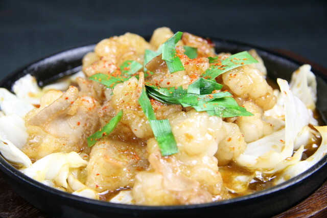秘伝のたれとアツアツの鉄板で焼いたもつ焼き鉄板 (by お店)