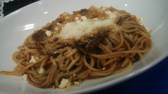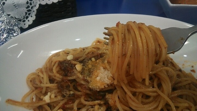 ほどなく、サーブされたスパゲティからは、ミートソースとスパイスのよい香りが漂ってきます。