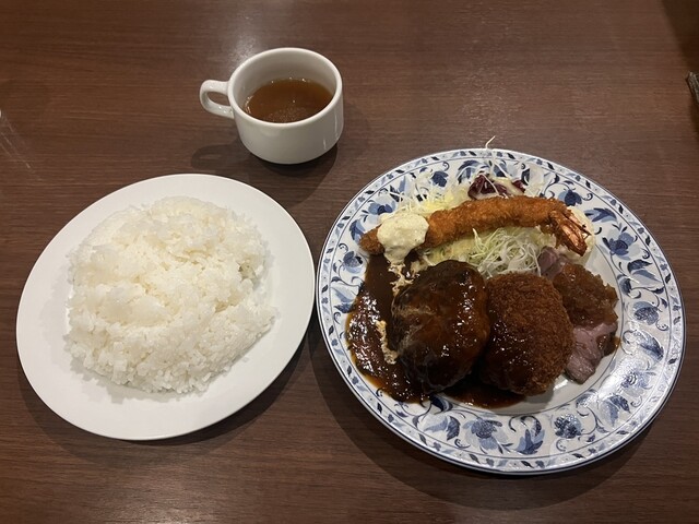 私はハンバーグにコロッケ、唐揚げも付いた定番のプレートにごはんとスープのセットをお願いしました。