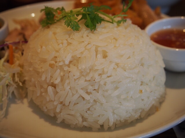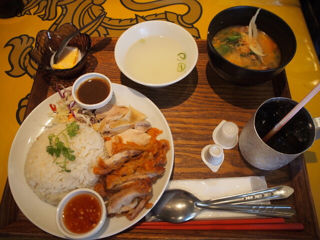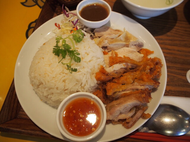 なんばでランチに、カオマンガイが食べたいと思い、大阪カオマンガイキッチンへ。蒸し鶏に加えて、揚げカオマンガイというのがあったので、それを注文。一階の二人掛けのテーブルに座ると、店内はまるでタイにいるような雰囲気で楽しい気分で待っていたら、2種類のソースがついたハーフ&ハーフが運ばれてきました。