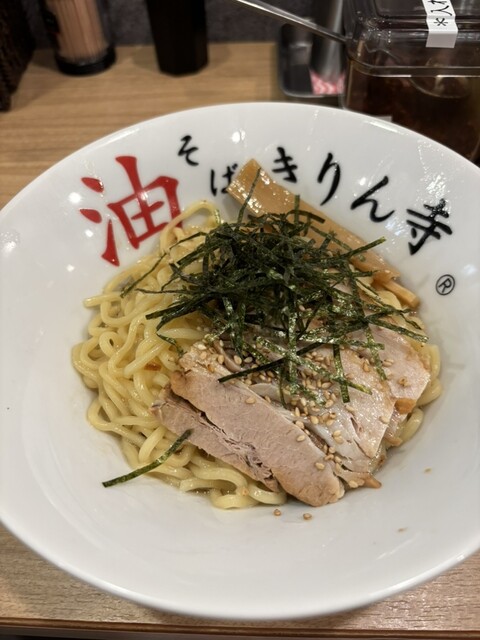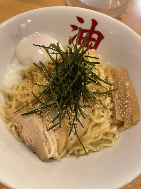 入口の券売機で食券を購入するシステム。キムチやら温泉卵やら色々とバリエーション有りましたが初見のお店でもありますのでここはベーシックな油そばをチョイス。店員さんに券を渡すとカウンター席へ案内頂きました。なんば、日本橋も近く、またゴールデンウィークの最中と言うこと...
