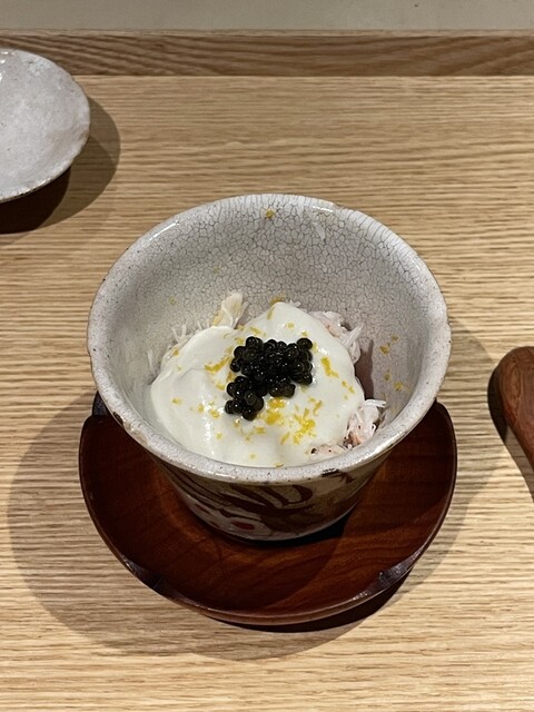 冬のユッケ(万葉牛きざみ,蟹(香澄),百合根(北海道),キャビア,柚子,塩胡椒オリーブオイルであわせて)