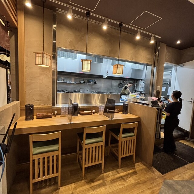店内はウッドカウンターの落ち着いた佇まい… カウンター内のオネーさん方のお出迎え〜