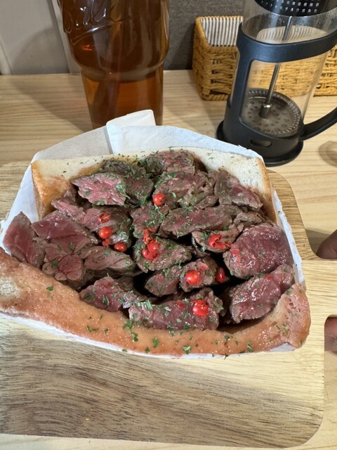 大阪の瓦屋町にある、ユニークな店名のサンドイッチ専門店です。 連日行列ができる人気店で、今回はランチで利用しました。 【注文したもの】 ・レアハラミサンド(400g) ・コーンスープ 【並び方の注意点】 お店の前に行列ができていますが、店舗に向かって「左側がテイクアウト」「右側が... 詳細を見る