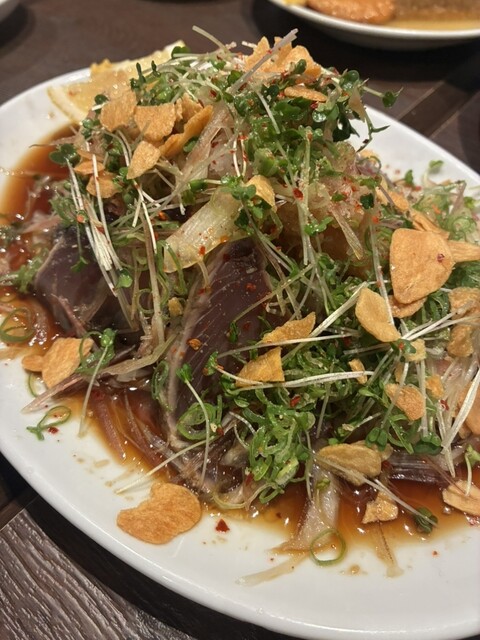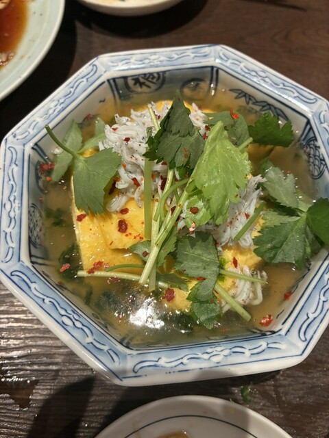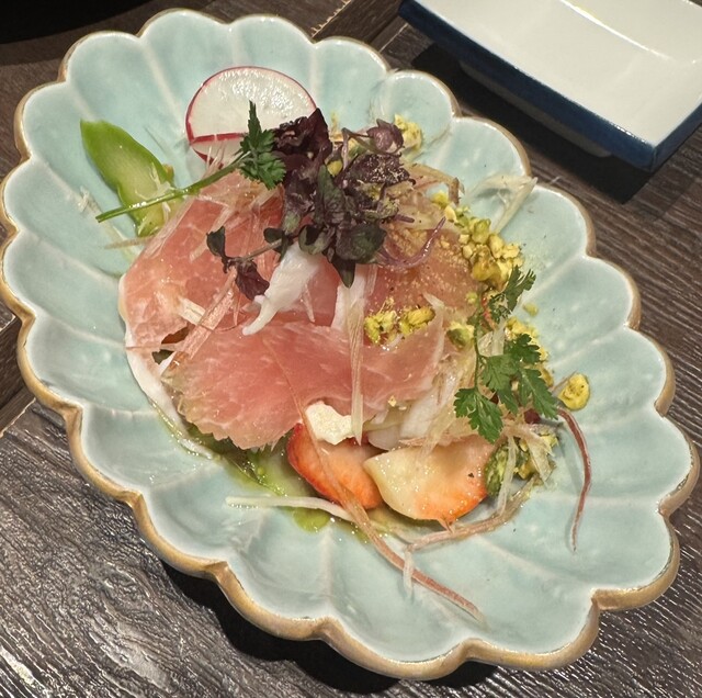 名物の「海鮮ユッケ皿」は、鮮魚と薬味、とろろ、卵黄が一体となり、口に運ぶごとに素材の旨味が重なっていく一品。