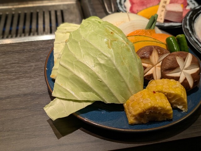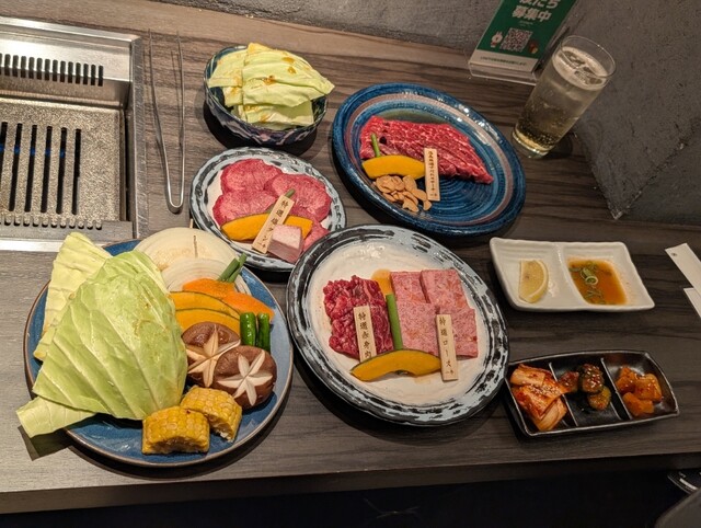 キムチ盛り合わせ、塩タン、赤身肉、ロース、すだれステーキ、ホルモン、焼き野菜、ご飯とゆずシャーベット、そして飲み放題120分(LO.90分)がついたお得なコース